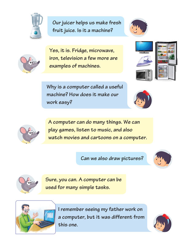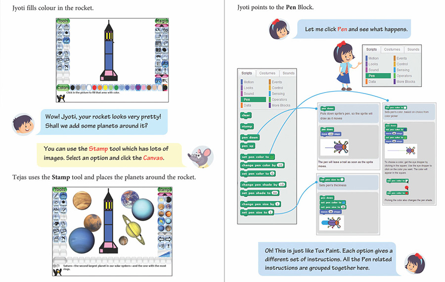 In Computer Masti books, concepts are discussed through conversations between three characters—Jyoti, Tejas and Moz, to make learning fun and engaging. Jyoti and Tejas are the learners, while Moz, the mouse, is the facilitator.